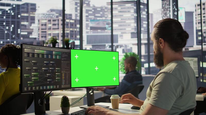 Man working with machine learning tech on green screen computer, advancing AI innovating autonomous systems, close up. Zoom in on mockup PC monitor used by IT expert in office, camera B Pro Video