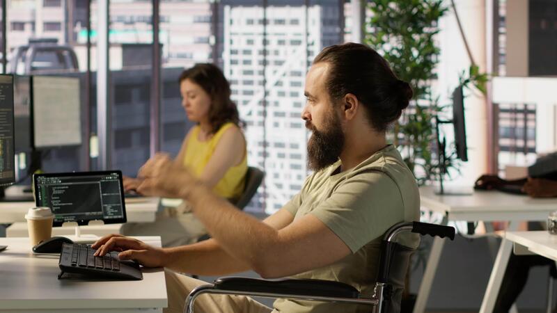 Person with impairment processing and analyzing data to automate decision making processes. IT specialist with disability programming in office, sitting in wheelchair, camera A Pro Video