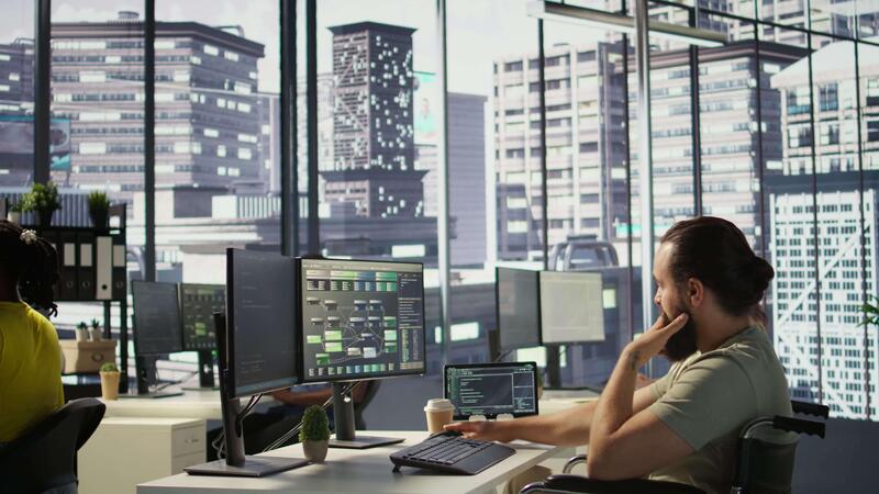 Person with impairment processing and analyzing data to automate decision making processes. IT specialist with disability programming in office, sitting in wheelchair, camera B Pro Video