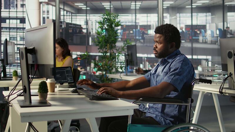 Man with paraplegia conducting code review to fix errors, identifying potential performance and technical issues with software. IT professional with disability in wheelchair optimizing code, camera B Pro Video