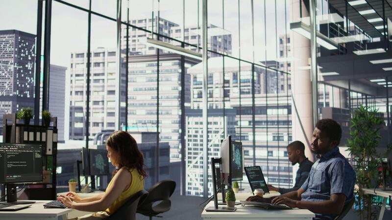 Tired admin stretches limbs while using PC for artificial intelligence computing simulating human brain. Fatigued worker relaxing back, feeling strained after working with AI neural networks, camera B Pro Video