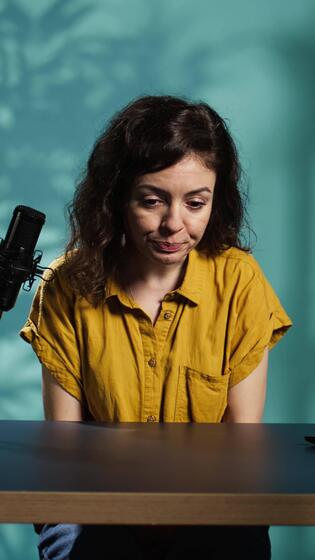 Vertical Content creator using smartphone on phone holder to shoot intro for vlog channel on online platforms. Internet star warmly welcoming dedicated fanbase, filming with cellphone, camera B Pro Video