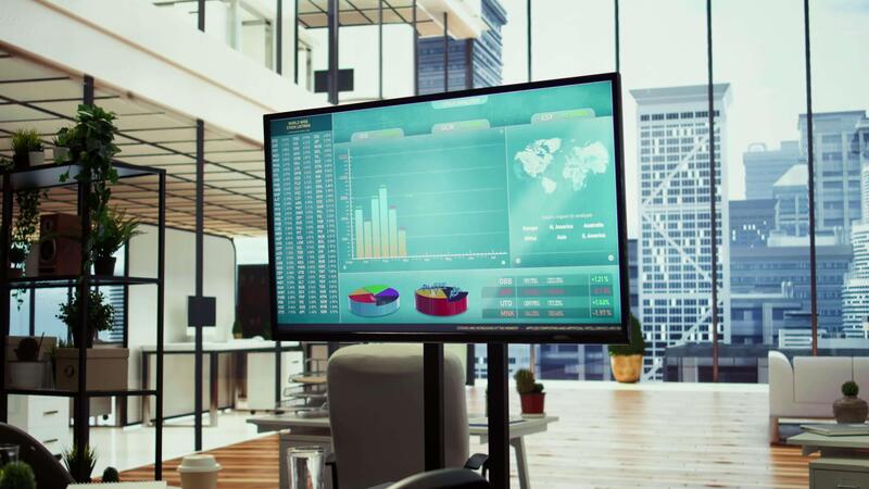 Empty modern office setup with advanced technology enhances productivity, helping professionals focus on financial strategies, performance metrics and global business objectives. Pro Video