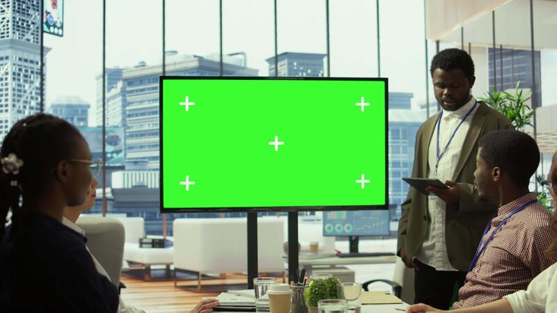 Employees and investors participating in a briefing next to isolated copy space display, reviewing economic indicators and performance metrics. Work team discussing finance planning. Camera B. Pro Video