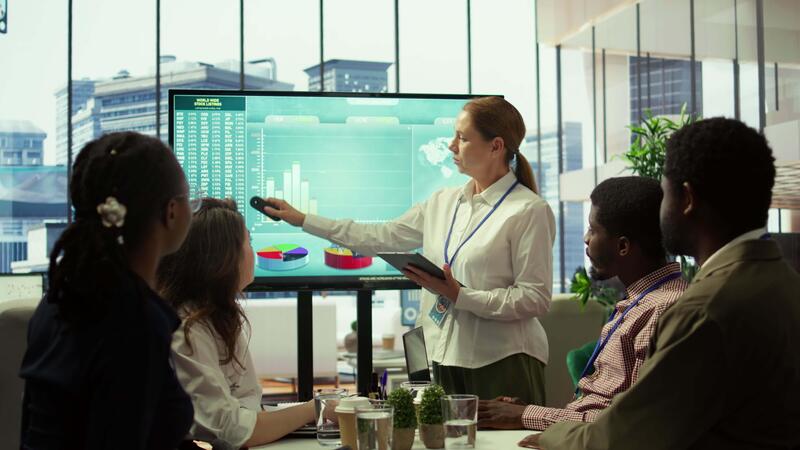 Group of business associates discussing project development plans, leveraging big data and advanced analytics to make informed decisions and enhance workflow. Multinational company. Camera B. Pro Video