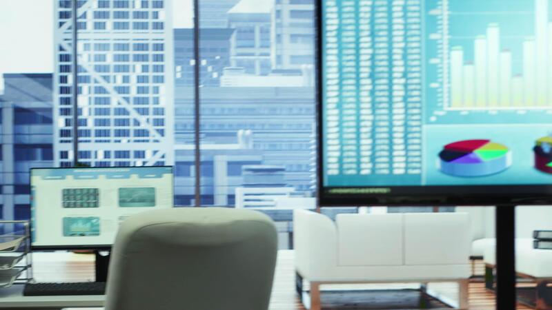 Empty boardroom setup with a computer displaying financial data, facilitates effective communication and strategy development for a successful business project. Performance goals. Pro Video