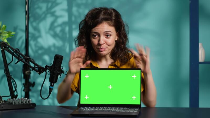 Woman in home studio using recording tech to capture live broadcast, reviewing mockup laptop. Internet show host filming electronics haul, presenting isolated screen notebook for viewers, camera A Pro Video