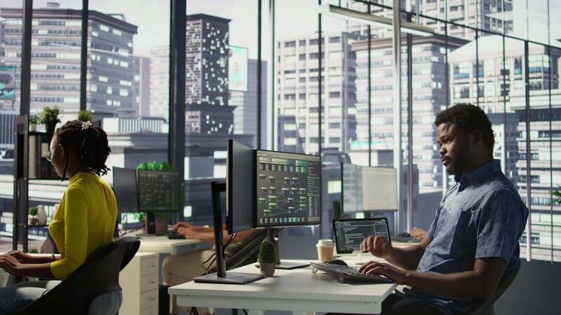 System administrator in office yawning during shift, feeling tired while looking at software interface on PC. Exhausted man being sleepy in workspace, programming on computer monitor, camera B Pro Video