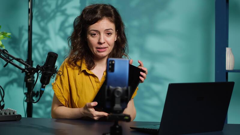 Tech expert presenting tablet in entry level low budget price range, filming from dimly lit home studio. Viral tech content creator reviewing digital device in front of online audience, camera A Pro Video