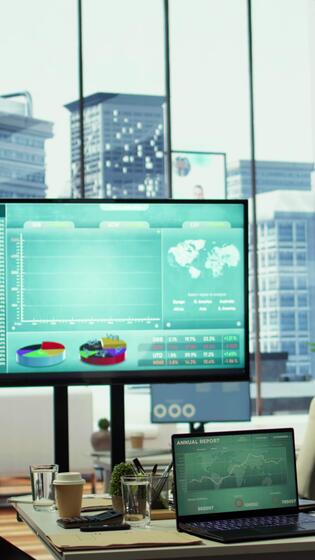 Vertical In a professional boardroom, computer screen showcases business data and statistics, aiding executives in strategy planning. Empty office space for meeting to help with workflow optimization. Pro Video