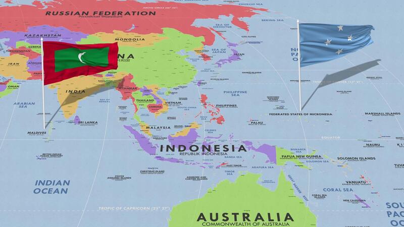 Federated States of Micronesia and Maldives Flag Waving with The World Map, Seamless Loop in Wind, 3D Rendering Free Video