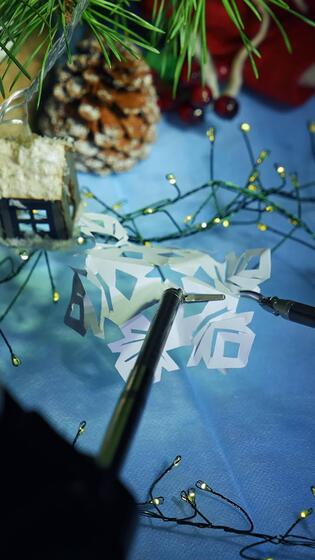 Robotic arms with tiny scissors and claw holding and cutting the paper snowflake. Da Vinci surgical system capabilities to sophisticated work. Close up. Vertical Pro Video