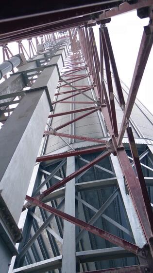 Pipes and supports at the grain-drying complex. High steel constructions at the backdrop of sky. View on the structure from below. Vertical Pro Video