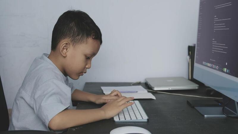 a boy is learning to do his schoolwork in front of a computer by typing his keyboard Pro Video