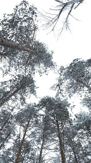 Dizzying view of winter trees. Media. Beautiful view from below of tree crowns in winter forest. Beautiful rotating view of treetops in winter Pro Video