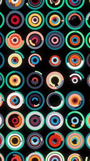 Abstract futuristic background with moving small circles placed in many horizontal parallel rows. Animation. Many moving rings on black background, seamless loop. Pro Video