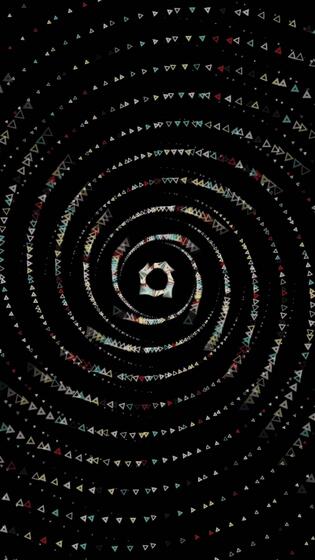 Abstract small triangles moving on a spiral trajectory and flying towards the camera, amazing 3D effect. Animation. Spinning geometric figures on black background. Pro Video