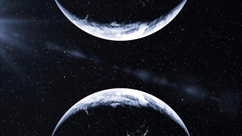 Rotating planet with its reflection. Motion. Illuminated with blue light in animation and its reflection and surrounded by stars. Pro Video