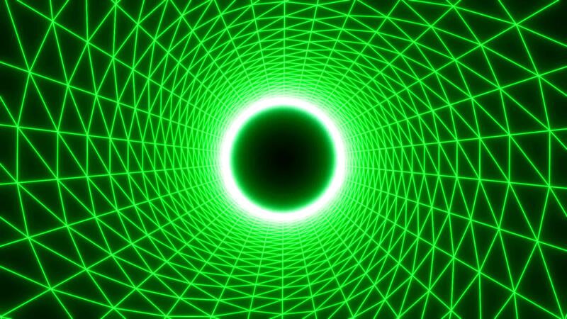 Flying inside neon striped circular tunnel with a dark pulsating sphere in the end. Motion. Endless digital journey. Pro Video