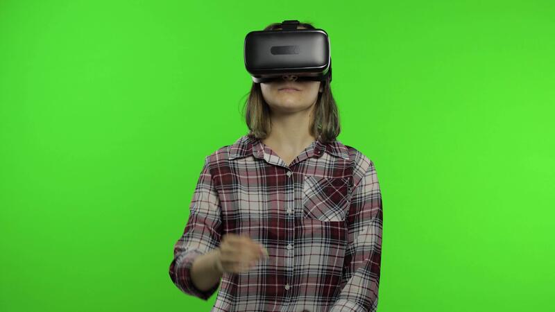 Girl using VR app helmet to play simulation game. Slide gestures. Watching virtual reality 3d Pro Video