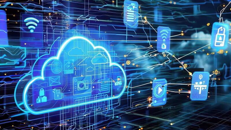 Visual representation of cloud computing technology with icons and data flow, symbolizing connectivity and security in the digital age. Free Video