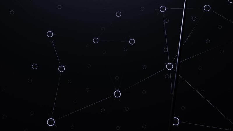 Purple and black background. Design. Lines fastened together with circles forming networks move from within in 3D graphics. Pro Video