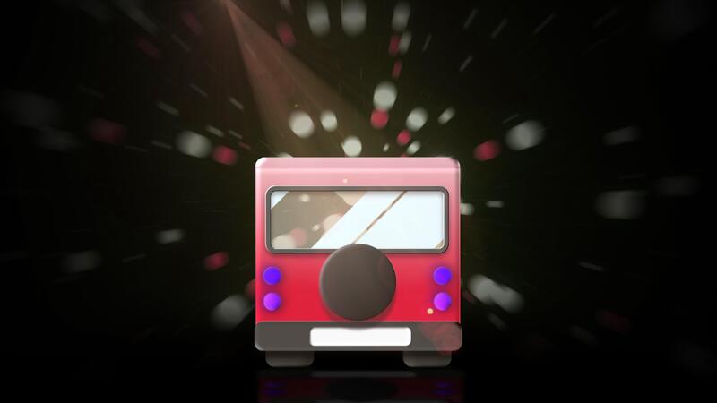 Cartoon bus moving on black background. Motion. Animation of bus running on background of stream of balls and darkness. Bus rides in center with stream of balls and beam of light on black background Pro Video
