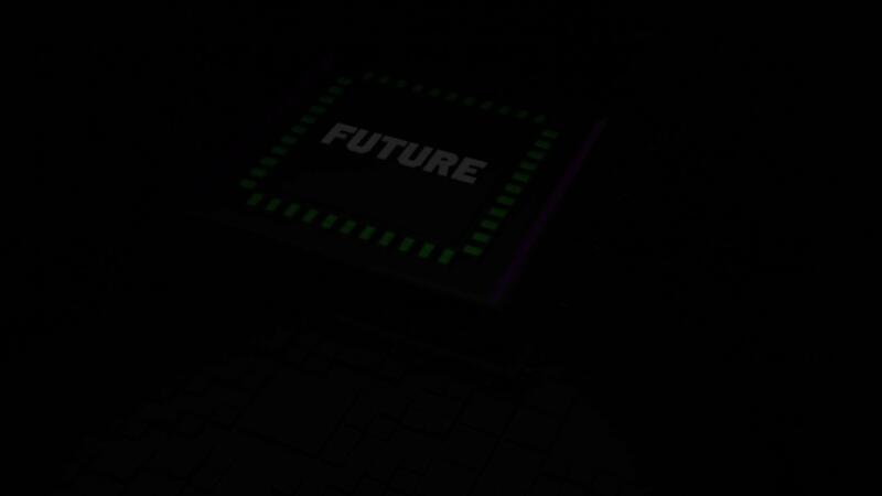 3d chip with neon nets. Design. 3D chip runs computer's software networks. Chip labeled Future Launches new neural network system Pro Video
