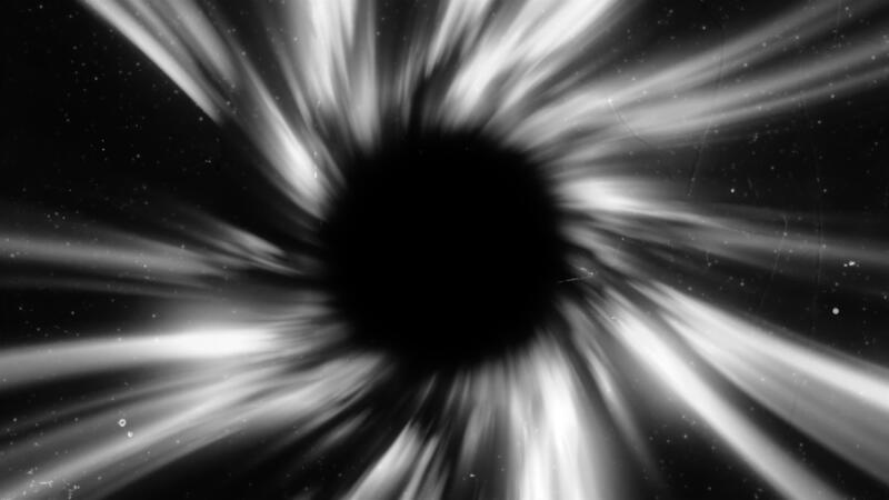 Black background with a portal. Motion. A bright portal with blue and white light, located as if in space and from which bright pieces of light scatter in 3D format. Pro Video