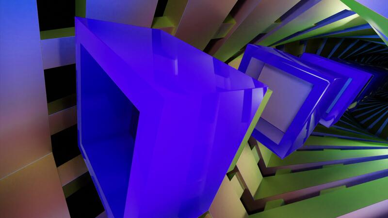 Abstract optical illusion with cubes flying through the square shaped silhouettes. Design. Colorful tunnel with levitating figures. Pro Video