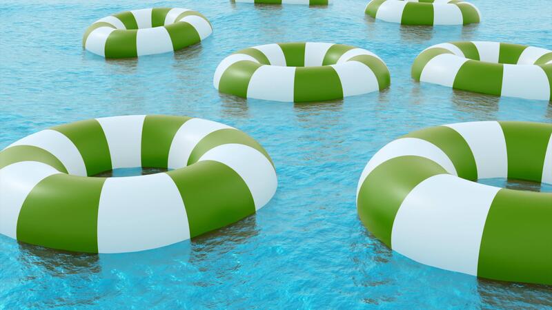 Elements of rescue in the water. Design. A calm sea with small life-rings is made in computer graphics. Pro Video
