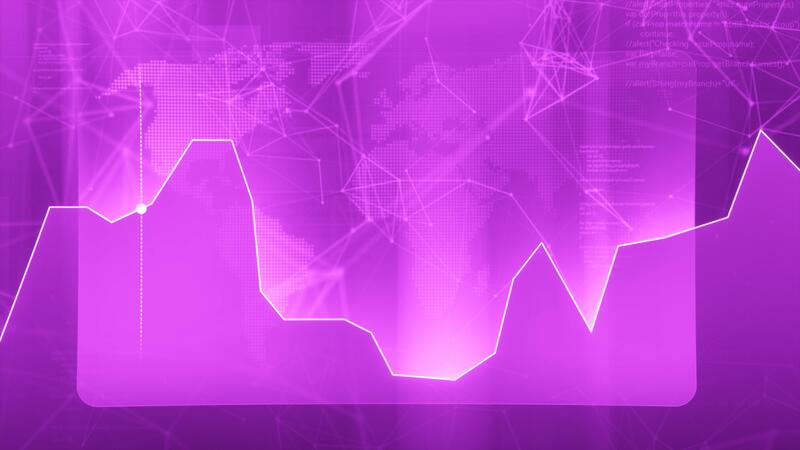 Purple moving graph. Motion. Running dot in animation on the background of various transparent flying figures. Pro Video