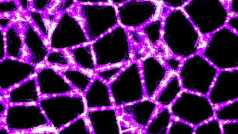 Dark background. Design. Purple and blue parts outlined in sparkling lines in 3D format move apart and narrow back. Pro Video