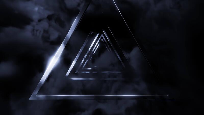 Flying inside futuristic abstract tunnel of metallic triangles and smoke. Design. Endless triangular metal shapes. Pro Video