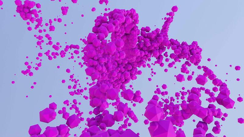 Abstract stream of colorful particles. Design. 3D futuristic background with abstract movement of pink cubes. Pro Video