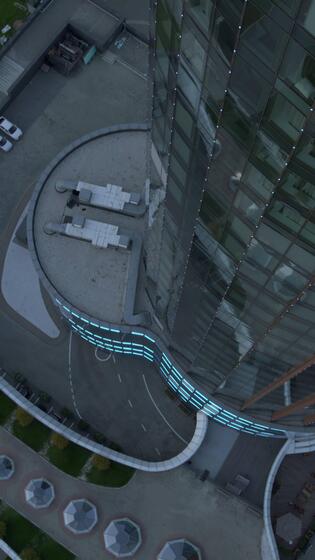 Top view of sunset reflection in windows of business high-rise. Stock footage. Modern skyscraper with glass windows and reflection. Reflection of city and sunset in windows of business building Pro Video