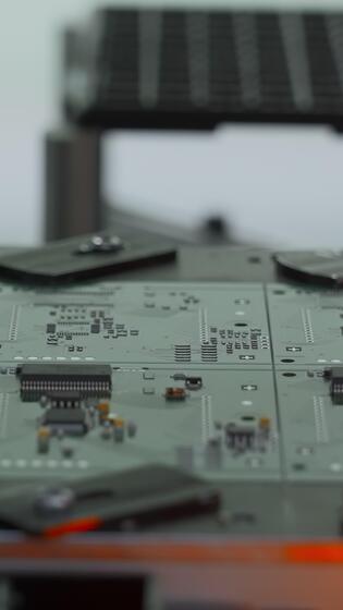 Coating machine for printed circuit board at work. Creative. Close up of automated robotic mechanism making circuit board. Pro Video