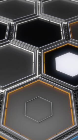 Abstract hexagons of different colors in rows, seamless loop. Animation. Close up of flat metal geometrical figures with colorful light lamps inside. Pro Video