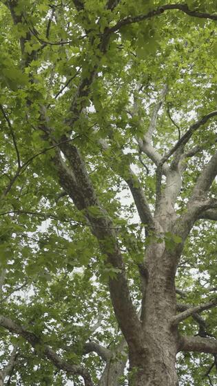 Walking under the summer tree. Action. Bottom view of the tree trunk and big branches with lush green leaves on cloudy sky background. Pro Video