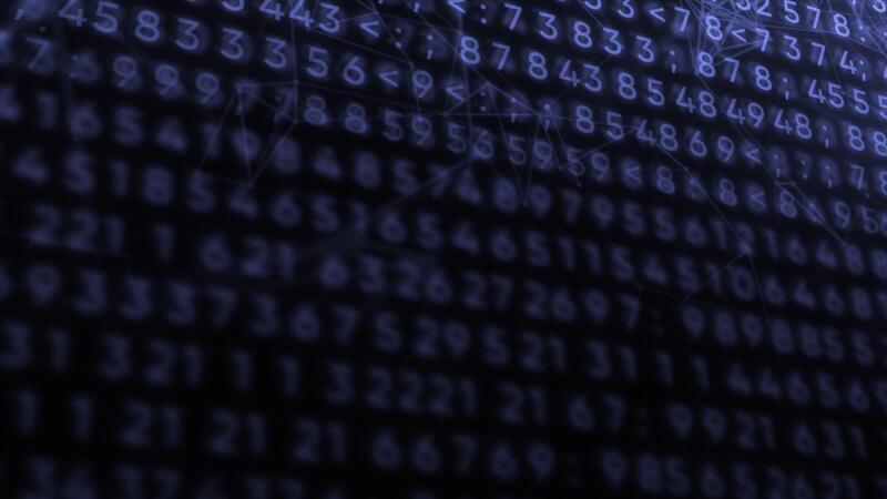Dark background with green and purple numbers. Motion.Complex digital codes that manifest themselves in abstraction. Pro Video