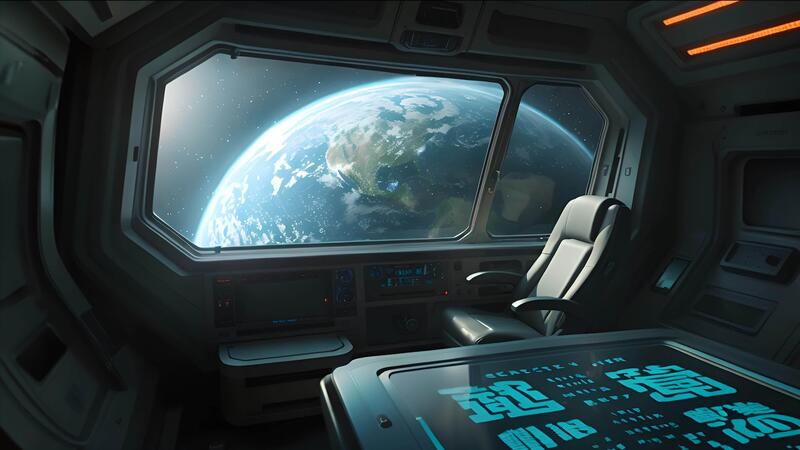Experience the wonder of space travel with this captivating image of a spaceship interior, featuring a panoramic window view of our blue planet. Pro Video