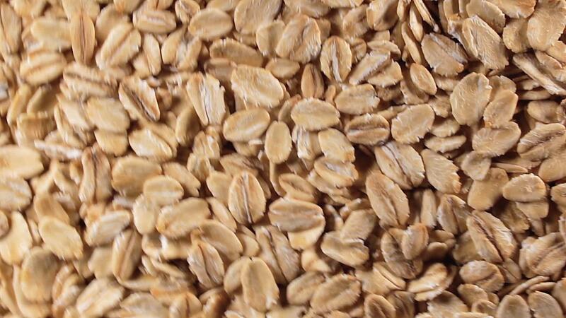 Oat Flakes Background Slowly Rotating Counter-Clockwise - Top View. Scattered Dry Oat Flakes. Healthy Breakfast and Diet Eating Ingredients - Angular Rotation Left Pro Video