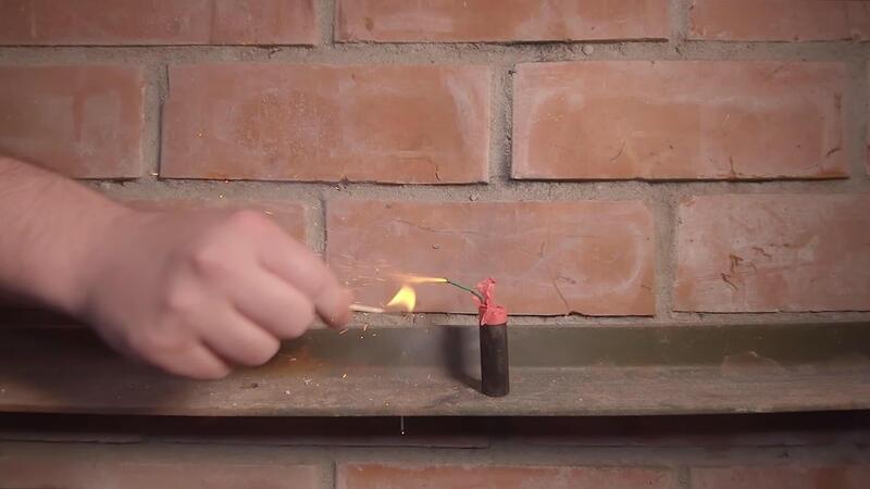 Firecracker Was Lighted Up With a Match then Explode Against a Brick Wall - Super Slow Motion. Many Small Particles Flew in a Different Directions - Static Shot Pro Video