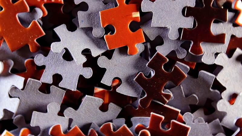 Background of Colored Puzzle Pieces that Slowly Rotating Counterclockwise - Top View, Close-Up. Texture of Incomplete Red and Grey Jigsaw Puzzle with Low Key Light - Left Rotation Pro Video