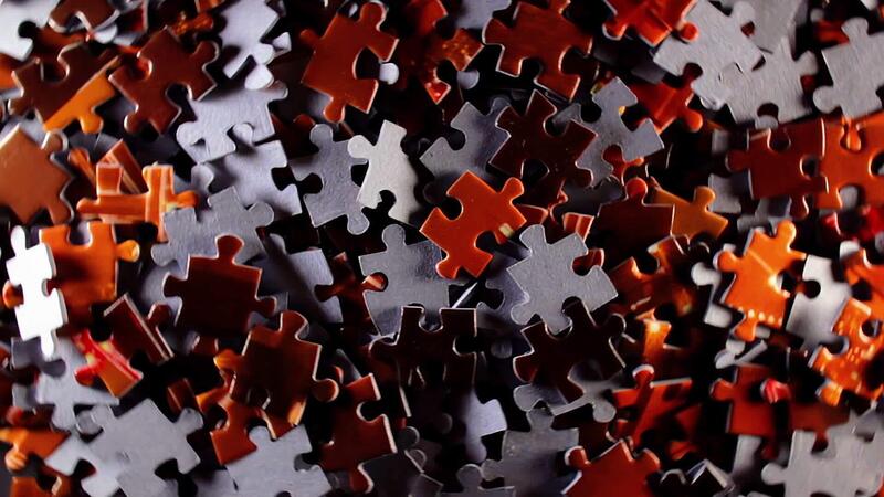 Background of Colored Puzzle Pieces that Rotating Counterclockwise - Top View. Texture of Incomplete Red and Grey Jigsaw Puzzle with Low Key Light - Left Rotation Pro Video