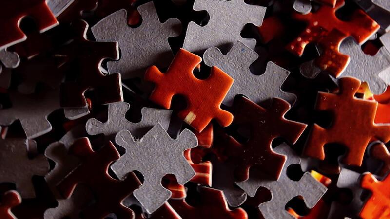 Background of Colored Puzzle Pieces that Slowly Rotating Counterclockwise - Top View, Close-Up. Texture of Incomplete Red and Grey Jigsaw Puzzle with Low Key Light - Left Rotation Pro Video