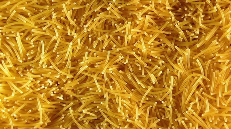 Background of Uncooked Noodles that Slowly Rotating Counterclockwise - Top View, Close-Up. Texture of Dry Vermicelli Turning Around. Raw Pasta with Low Key Light - Left Rotation Pro Video