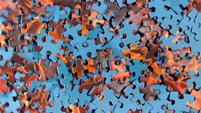 Background of Colored Puzzle Pieces that Rotating Clockwise - Top View. Texture of Incomplete Red and Blue Jigsaw Puzzle - Right Rotation Pro Video