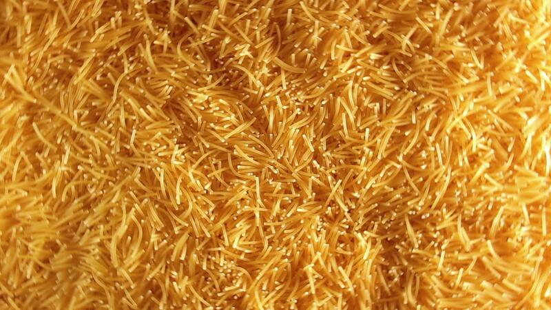 Background of Uncooked Golden Noodles that Rotating Clockwise - Top View. Texture of Dry Vermicelli Turning Around. Raw Pasta with Low Key Light - Right Rotation Pro Video