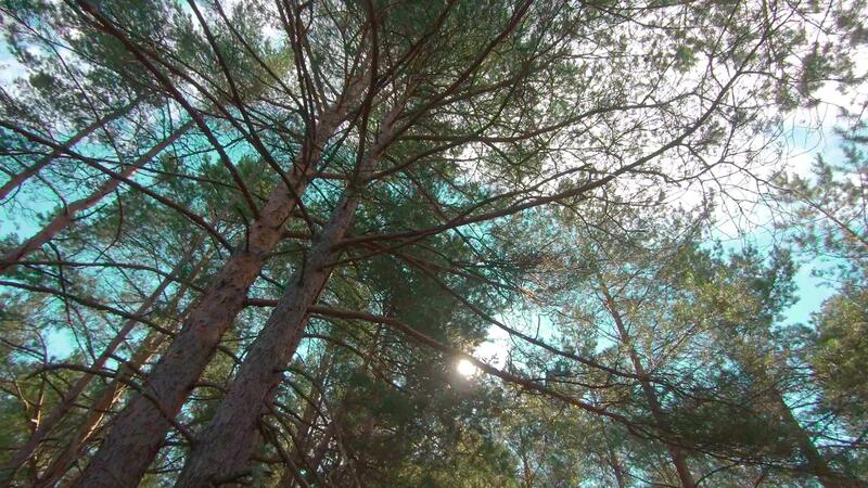 Walking Through the Pine Forest and Looking Up to the Trees. Bottom View of Pine Crowns at Sunny Summer Day. The Sky Can Be Seen Through the Tops of the Trees Pro Video